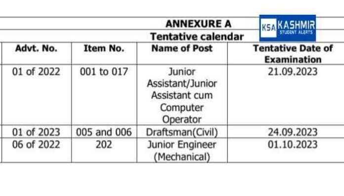 Services Selection Board(JKSSB) is scheduled to conduct examinations for the posts of Junior Assistant/Junior Assistant cum Computer Operator, Junior Engineer(Mechanical) and Draftsman(Civil) tentatively as per the details contained in Annexure A.