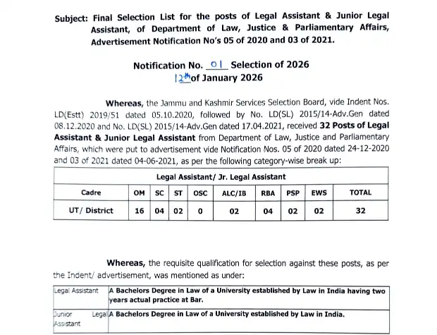 The Jammu and Kashmir Services Selection Board (JKSSB) has officially released the Final Selection List for the posts of Legal Assistant and Junior Legal Assistant in the Department of Law, Justice & Parliamentary Affairs. The selection list has been notified through Notification No. 01 – Selection of 2026 dated 12 January 2026. This much-awaited announcement brings relief and clarity to thousands of aspirants who appeared in the JKSSB recruitment process under Advertisement Notification No. 05 of 2020 and 03 of 2021.