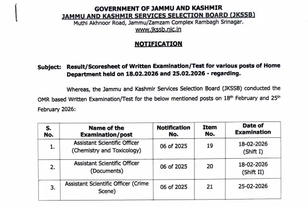 The Jammu and Kashmir Services Selection Board has issued an important notification regarding the Result/Scoresheet of Written Examination/Test for various posts of Home Department, conducted on 18 February 2026 and 25 February 2026. Candidates who appeared in the recruitment examination can now check their results and download the official PDF from the JKSSB website.