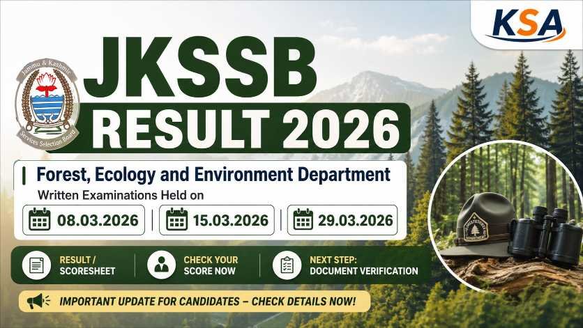The Jammu and Kashmir Services Selection Board (JKSSB) has officially released the much-awaited Result/Scoresheet of Written Examinations for various posts under the Forest, Ecology and Environment Department. Candidates who appeared in the written examinations conducted on 08.03.2026, 15.03.2026, and 29.03.2026 can now check their scoresheets and result notifications issued by JKSSB.