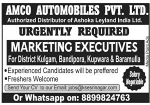 Amco Automobiles Pvt. Ltd., an authorized distributor of Ashoka Leyland India Ltd., is urgently seeking Marketing Executives for the districts of Kulgam, Bandipora, Kupwara, and Baramulla. This is an excellent opportunity for both experienced candidates and freshers.