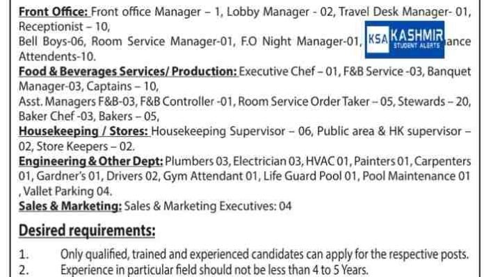 Baker Chef -03, Bakers – 05, Housekeeping / Stores: Housekeeping Supervisor – 06, Public area & HK supervisor – 02, Store Keepers – 02. Engineering & Other Dept: Plumbers 03, Electrician 03, HVAC 01, Painters 01, Carpenters 01, Gardner’s 01, Drivers 02, Gym Attendant 01, Life Guard Pool 01, Pool Maintenance 01, Vallet Parking 04.