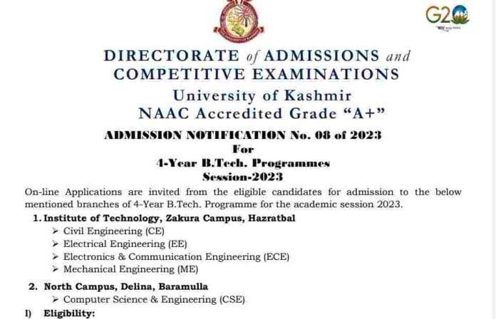 Kashmir University Admission Notification For 4-Year B.Tech Programmes Session-2023
