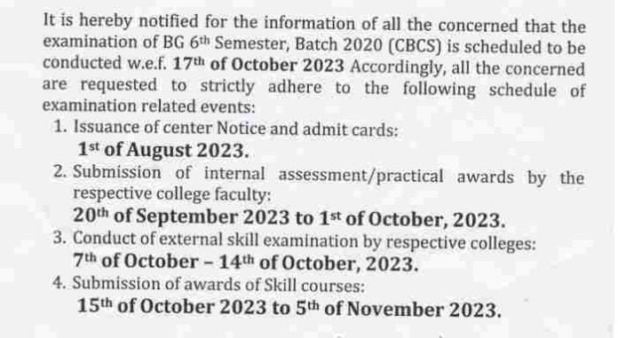 It is hereby notified for the information of all the concerned that the examination of BG 6th Semester, Batch 2020 (CBCS) is scheduled to be conducted w.e.f. 17th of October 2023 Accordingly, all the concerned are requested to strictly adhere to the following schedule of examination related events: