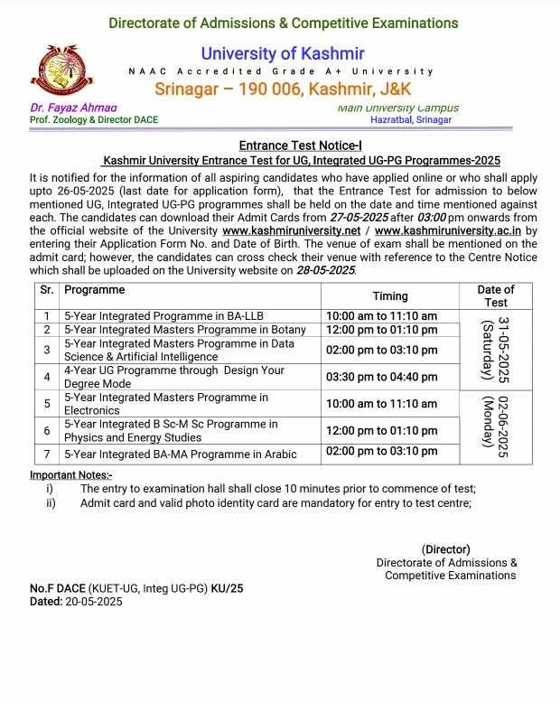 The University of Kashmir has officially released the notification for the Kashmir University Entrance Test 2025 for admission to various UG and Integrated UG-PG programmes. This entrance test is crucial for students seeking admission into prestigious 5-year and 4-year integrated programmes offered by the university.