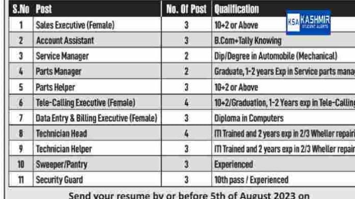 KY Autowheels Srinagar jobs recruitment 2023 for various posts