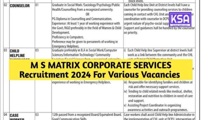 M S MATRIX CORPORATE SERVICES has announced job vacancies for various positions in its mission, Vatsalya, aimed at child welfare in District Baramulla. The organization is seeking dedicated individuals to join its team on an outsourced basis, contributing to the noble cause of child protection and support.