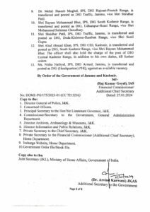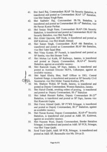 The order further reads that, Sunil Raj, Commandant JKAP 7th Security Battalion, is transferred and posted as Commandant JKAP 12th Battalion, vice Sanjay Singh Rana; Sukhdev Raj, Commandant IR-7th Battalion, is transferred and posted as Commandant IR-16th Battalion, vice Pawan Kumar Parihar; Sanjay Singh Rana, Commandant JKAP-12th Security Battalion, is transferred and posted as Commandant JKAP-7th Security Battalion, vice Sunil Raj; Abdul Qayoom, SSP Doda, is transferred and posted as SSP Kishtwar, vice Shri Khalil Ahmad; Suram Singh, Commandant JKAP 6th Battalion, is transferred and posted as Commandant JKAP 8th Battalion, vice Tahir Sajad Bhat; Vinay Kumar, SP Poonch, is transferred and posted as SP Samba, vice Benam Tosh; Mohan Lal Kaith, SP Railways, Jammu, is transferred and posted as Deputy Commandant, JKAP-4th Security Battalion, against an available vacancy; Ramnish Gupta, SP Hqrs, Jammu, is transferred and posted as Assistant Director SKPA, Udhampur, against an available vacancy; Sajad Khaliq Bhat, Staff Officer to DIG, Central Kashmir Range, is transferred and posted as SP Security Civil Secretariat, vice Mohd. Yaseen Kichloo, IPS; Shaheen Wahid, SP South, Jammu, is transferred and posted as Deputy Commandant, Women Battalion, Jammu; Rahul Charak, awaiting orders of posting, is transferred and posted as Deputy Commandant, IR-1″ Battalion; Irshad Hussain Rather, Deputy Commandant IR-23rd Battalion, is transferred and posted as SP Hqrs, Jammu vice Ramnish Gupta; Feroz Ahmad Qadri, SP PTWS Srinagar, is transferred and posted as Deputy Commandant, IR-5th Battalion, against an available vacancy; Pawan Kumar, Deputy Commandant, JKAP-4th Security Battalion, is transferred and posted as Addl. SP, Kishtwar, against an available vacancy; Nayeem Wani, Deputy Commandant, Border Battalion Srinagar, is transferred and posted as Addl. SP PCR, Srinagar, vice Yasar Qadri; Syed Yasir Qadri, Addl. SP PCR, Srinagar, is transferred and posted as Addl. SP, Baramulla vice Divya D; Sajad Ahmad Sheikh, Deputy Commandant, Women Battalion Kashmir, is transferred and posted as Addl. SP Anantnag, against an available vacancy; Ajay Sharma, Addl. SP, SIA, is transferred and posted as SP South, Jammu, vice Ms. Shaheen Wahid and Shukat Rafiq Wani, awaiting adjustment is posted as Addl. SP Shopian, against an available vacancy.