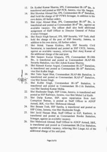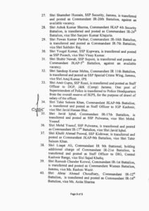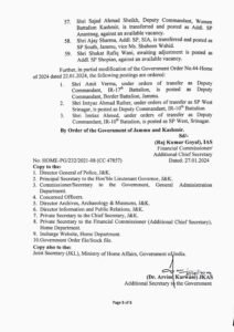 The order further reads that, Sunil Raj, Commandant JKAP 7th Security Battalion, is transferred and posted as Commandant JKAP 12th Battalion, vice Sanjay Singh Rana; Sukhdev Raj, Commandant IR-7th Battalion, is transferred and posted as Commandant IR-16th Battalion, vice Pawan Kumar Parihar; Sanjay Singh Rana, Commandant JKAP-12th Security Battalion, is transferred and posted as Commandant JKAP-7th Security Battalion, vice Sunil Raj; Abdul Qayoom, SSP Doda, is transferred and posted as SSP Kishtwar, vice Shri Khalil Ahmad; Suram Singh, Commandant JKAP 6th Battalion, is transferred and posted as Commandant JKAP 8th Battalion, vice Tahir Sajad Bhat; Vinay Kumar, SP Poonch, is transferred and posted as SP Samba, vice Benam Tosh; Mohan Lal Kaith, SP Railways, Jammu, is transferred and posted as Deputy Commandant, JKAP-4th Security Battalion, against an available vacancy; Ramnish Gupta, SP Hqrs, Jammu, is transferred and posted as Assistant Director SKPA, Udhampur, against an available vacancy; Sajad Khaliq Bhat, Staff Officer to DIG, Central Kashmir Range, is transferred and posted as SP Security Civil Secretariat, vice Mohd. Yaseen Kichloo, IPS; Shaheen Wahid, SP South, Jammu, is transferred and posted as Deputy Commandant, Women Battalion, Jammu; Rahul Charak, awaiting orders of posting, is transferred and posted as Deputy Commandant, IR-1″ Battalion; Irshad Hussain Rather, Deputy Commandant IR-23rd Battalion, is transferred and posted as SP Hqrs, Jammu vice Ramnish Gupta; Feroz Ahmad Qadri, SP PTWS Srinagar, is transferred and posted as Deputy Commandant, IR-5th Battalion, against an available vacancy; Pawan Kumar, Deputy Commandant, JKAP-4th Security Battalion, is transferred and posted as Addl. SP, Kishtwar, against an available vacancy; Nayeem Wani, Deputy Commandant, Border Battalion Srinagar, is transferred and posted as Addl. SP PCR, Srinagar, vice Yasar Qadri; Syed Yasir Qadri, Addl. SP PCR, Srinagar, is transferred and posted as Addl. SP, Baramulla vice Divya D; Sajad Ahmad Sheikh, Deputy Commandant, Women Battalion Kashmir, is transferred and posted as Addl. SP Anantnag, against an available vacancy; Ajay Sharma, Addl. SP, SIA, is transferred and posted as SP South, Jammu, vice Ms. Shaheen Wahid and Shukat Rafiq Wani, awaiting adjustment is posted as Addl. SP Shopian, against an available vacancy.
