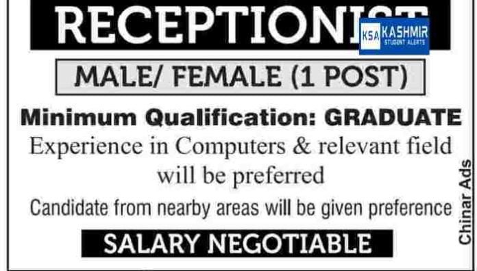 RECEPTIONIST Jobs in Srinagar, check qualification