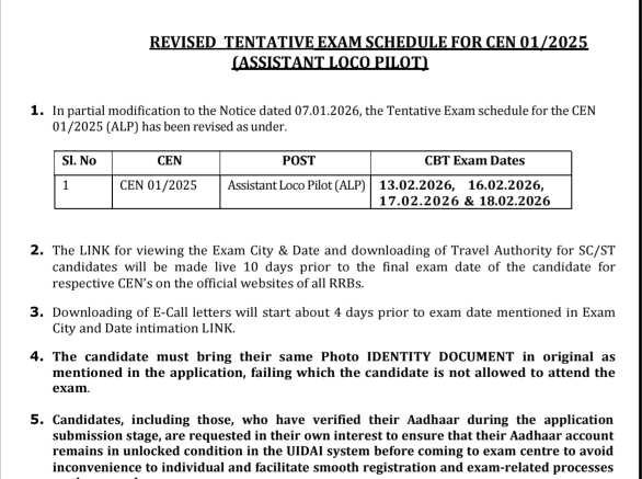 The Railway Recruitment Board (RRB) under the Ministry of Railways, Government of India, has officially released the Revised Tentative Exam Schedule for CEN 01/2025 (Assistant Loco Pilot – ALP).