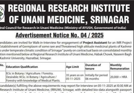 The Regional Research Institute of Unani Medicine (RRIUM), Srinagar, functioning under the Central Council for Research in Unani Medicine (CCRUM), Ministry of AYUSH, Government of India, has released Advertisement Notice No. 04/2025 inviting eligible candidates for a Walk-in Interview for the post of Project Assistant. The position is being offered on a contractual basis for an IMR project titled “Establishment of Germplasm of some Rare and Threatened High Altitude Medicinal Plants of Kashmir Himalayas under Temperate Climatic Conditions of Srinagar”.