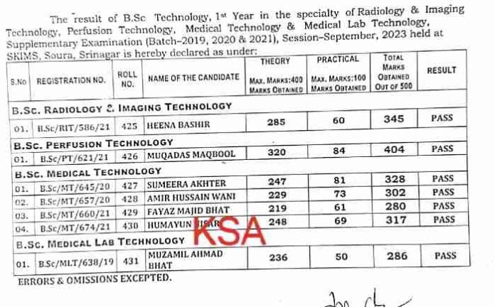 The result of B.Sc Technology, 1st Year in the specialty of Radiology & Imaging Technology, Perfusion Technology, Medical Technology & Medical Lab Technology, Supplementary Examination (Batch-2019, 2020 & 2021), Session-September, 2023 held at SKIMS, Soura, Srinagar is hereby declared as under: