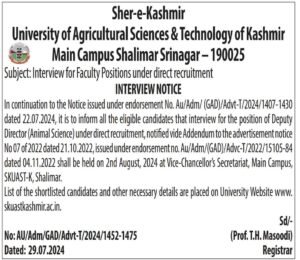 The interview is scheduled to take place on 2nd August, 2024 at the Vice-Chancellor’s Secretariat, Main Campus, SKUAST-K, Shalimar.