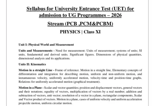 The Sher-e-Kashmir University of Agricultural Sciences and Technology of Kashmir (SKUAST-K) has released the official syllabus for the University Entrance Test (UET) 2026 for undergraduate admissions. Physics plays a crucial role for students applying under PCB, PCM, and PCBM streams, making it essential to understand the complete Class XI syllabus.