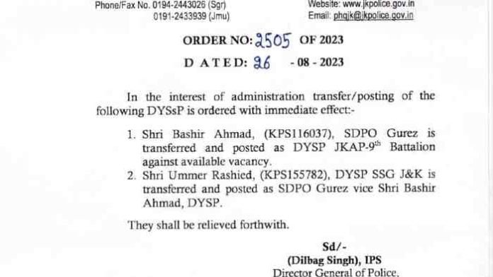 1. Shri Bashir Ahmad, (KPS116037), SDPO Gurez is transferred and posted as DYSP JKAP.9h Battalion against available vacancy.