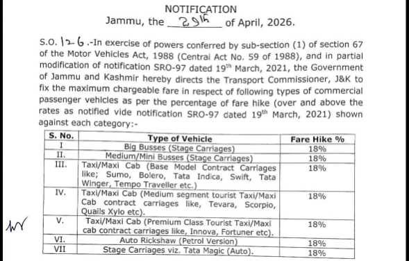 The Government of Jammu and Kashmir has announced an 18% increase in fares for commercial passenger vehicles across the Union Territory. The decision was issued by the Transport Department, Civil Secretariat, J&K, through an official notification dated April 29, 2026.