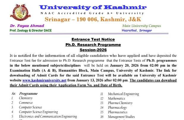 The University of Kashmir has officially announced the schedule for the Entrance Test for admission to the Ph.D. Research Programme Session 2026 under the Directorate of Admissions & Competitive Examinations. The notification states that the entrance examinations for various disciplines will be conducted on January 20, 2026, from 02:00 PM onwards, at the Humanities Block (Examination Halls A & B), Main Campus, Hazratbal, Srinagar.