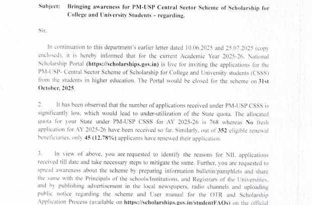 According to the communication enclosed with the circular, the Ministry of Education noted that the number of applications received so far from eligible students has been significantly low for the academic session 2025-26. This means a large portion of the scholarship quota allotted to the state may go unused — leading to under-utilization of available financial assistance meant for students.