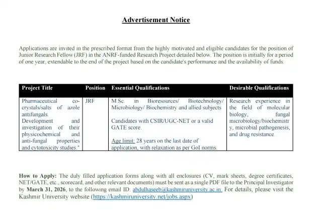The Kashmir University JRF Recruitment 2026 is an excellent opportunity for postgraduate candidates in life sciences to engage in meaningful research. With a strong focus on antifungal drug development, this position offers both academic and professional growth.