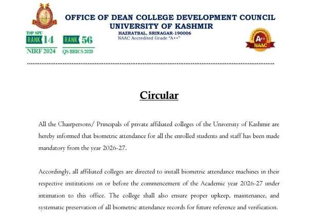 The University of Kashmir (KU) has officially announced that biometric attendance will be mandatory for all students and staff in private affiliated colleges from the academic session 2026–27. The decision has been communicated through a formal circular issued by the Office of the Dean, College Development Council (CDC), University of Kashmir.