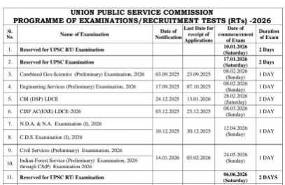 The Union Public Service Commission (UPSC) has officially released the Programme of Examinations and Recruitment Tests (RTs) for the year 2026, providing aspirants with a clear roadmap of all major national-level competitive examinations. This comprehensive UPSC Exam Calendar 2026 includes notification dates, application deadlines, exam commencement dates, and exam durations for prestigious examinations such as Civil Services, NDA, CDS, Engineering Services, IES/ISS, CAPF, CMS, and more.